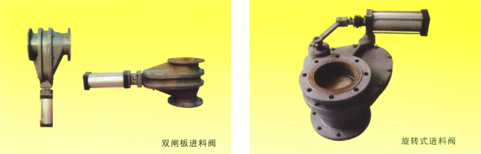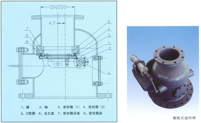 进料阀设置于发送器顶部,用于发送器的进料进行控制。其工作原理是由外部气缸带动轴作90°回转,从而带动法兰盘,当法兰盘向上时,即关闭进料阀;当法兰盘向下时,既打开进料阀。密封是依靠固定在阀体上密封圈(1)和固定在法兰盘上密封圈(2)的紧密接触为实现的。